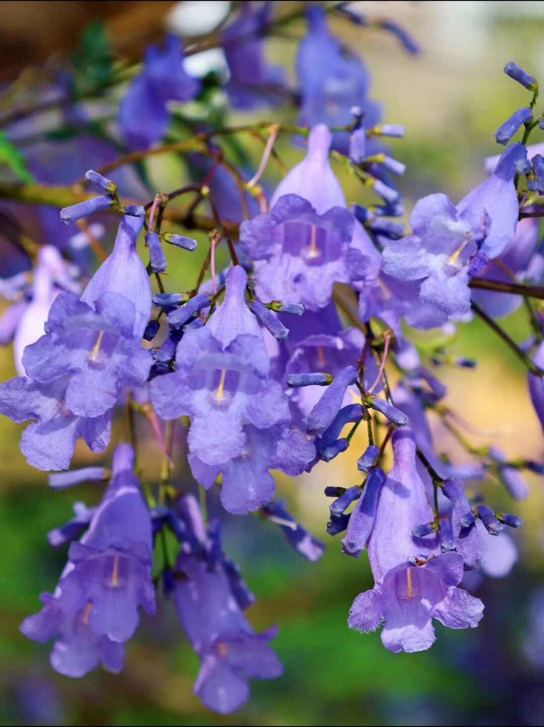蓝花楹的叶子像羽毛,花是喇叭形状的,很多小花长在一起,变成一个大花串,颜色从浅紫色到深紫色都有。开花的时候叶子很少,满树都是花,远远看去非常漂亮。