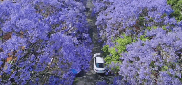 它的花期不长,盛花期大概就二十天。那么,我就先带你走进蓝花楹限定路线: